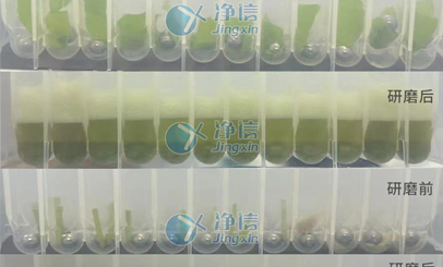 實驗樣品:本次實驗樣品為水稻葉片,此次選用凈信多樣品組織研磨進行前處理操作,提取RNA實驗。實驗?zāi)康模褐参锖怂崽崛∈且粋€通過簡易化、可操作性的手段獲取“pure” DNA和RNA的過程。植物組織越幼嫩新鮮所含的次生代謝產(chǎn)物越少,隨著植物組織的逐漸成熟,次生代謝產(chǎn)物的含量會逐漸增多。