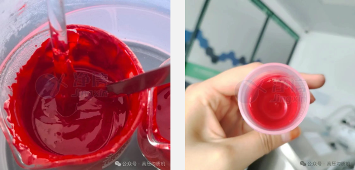 啟動設(shè)備,物料在高壓下被均質(zhì),流出后即可觀察到質(zhì)地變得絲滑、色澤均勻亮麗。