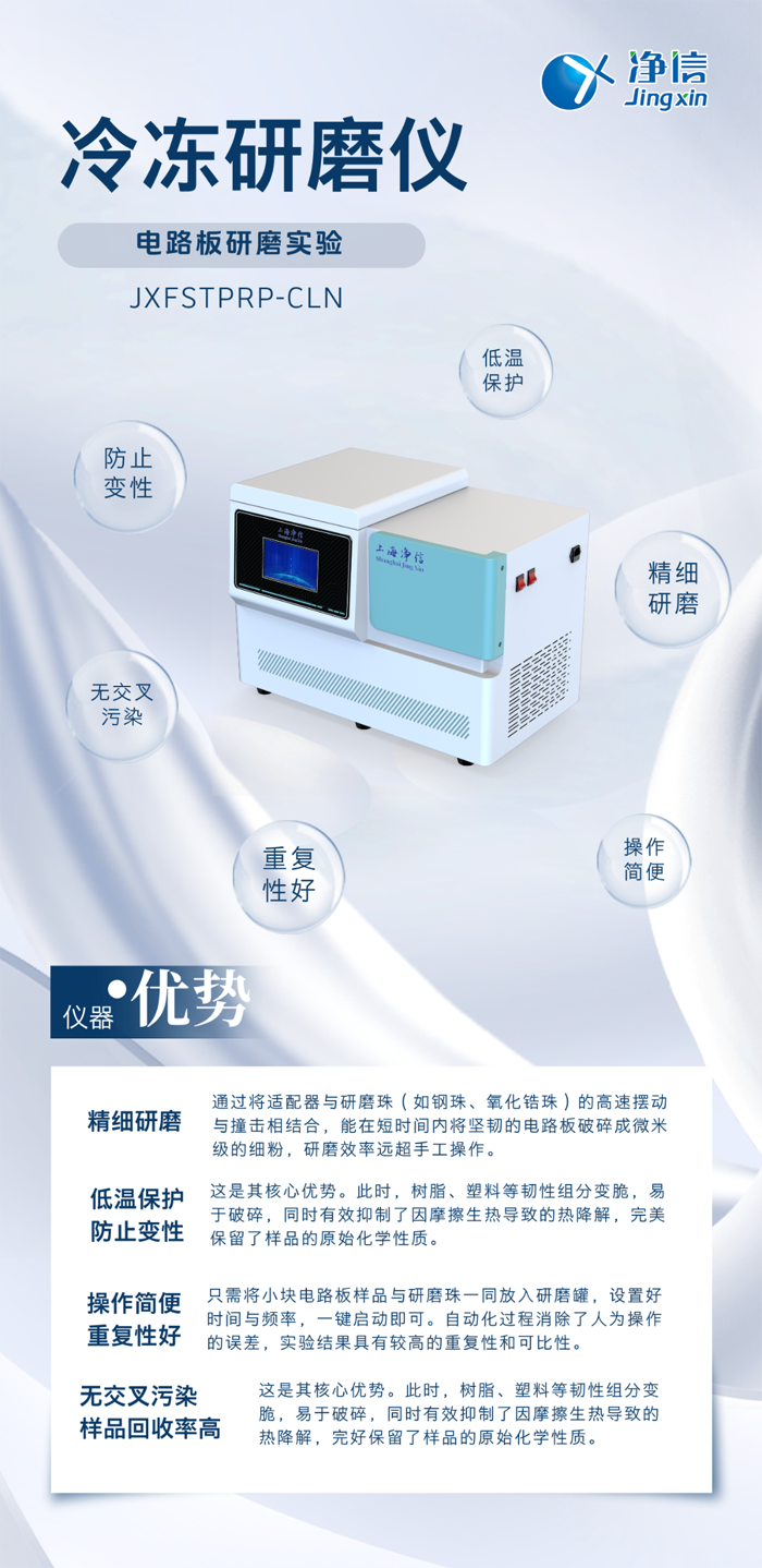 凈信冷凍研磨儀憑借其低溫、避免污染的研磨特性,成功解決了電路板這類復(fù)雜復(fù)合材料的前處理難題。它不僅是提升RoHS檢測、材料成分分析等數(shù)據(jù)準(zhǔn)確性的“得力助手”,也是在電子廢棄物資源回收領(lǐng)域進行物料分析的“神兵利器”。選擇凈信冷凍研磨儀,意味著選擇了一條通往更可靠實驗結(jié)果的捷徑,為您的科研與質(zhì)控工作提供了強有力的技術(shù)保障。