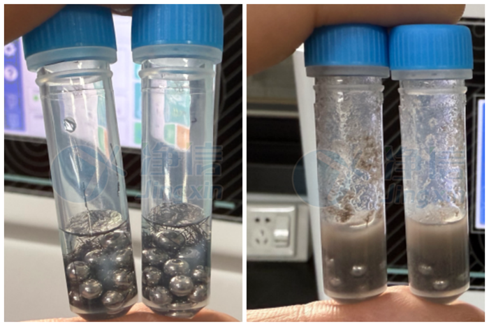 毛發(fā)樣品研磨前后對比,1分鐘內可以研磨到勻漿狀態(tài)