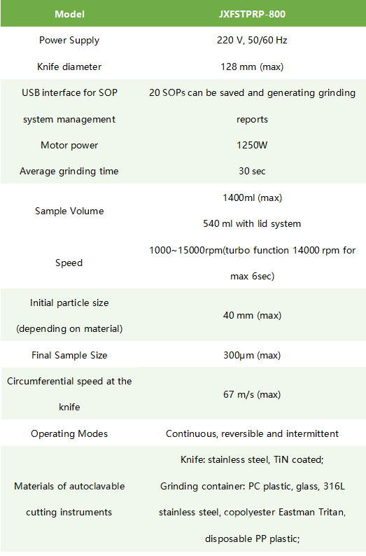 The JXFSTPRP-800 Knife Mill is a specialized instrument designed for grinding and homogenization. Utilizing high-speed rotation and a variety of accessories (stainless steel, PC, PP), it can pulverize samples to analytical fineness within seconds. The homogenization results are highly consistent, meeting the diverse professional requirements of laboratory operations and analytical processes. This instrument is widely used in the grinding food products, effectively grinding dry, soft, elastic, fibrous, and medium-hard samples, as well as homogenizing samples with high moisture, oil, and fat content.