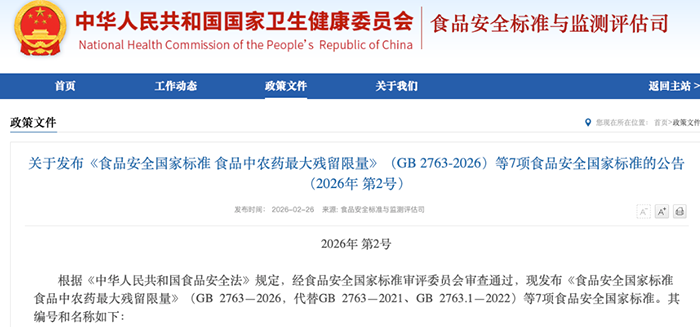 圖片來源說明: 本文政策文件截圖來源于中華人民共和國國家衛(wèi)生健康委員會官方網(wǎng)站公開信息(食品安全標(biāo)準(zhǔn)與監(jiān)測評估司,2026年第2號公告),僅供政策解讀與行業(yè)交流使用。