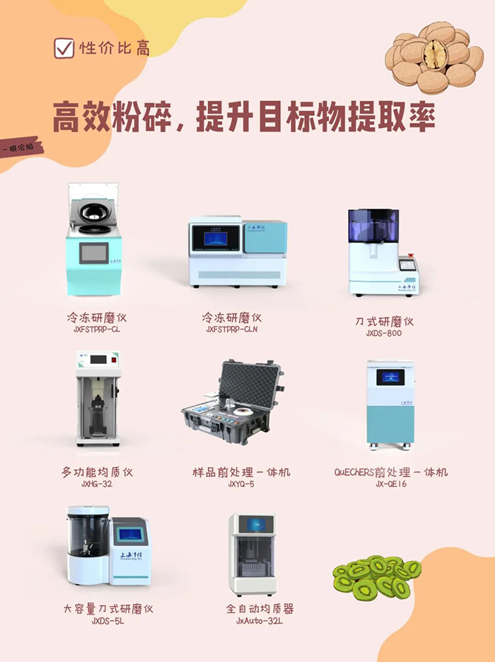 樣品研磨是農(nóng)殘?zhí)崛〉幕A(chǔ),凈信多款研磨儀針對不同農(nóng)產(chǎn)品基質(zhì)、檢測需求設(shè)計,實現(xiàn)樣品快速、充分粉碎,大幅提升農(nóng)藥提取率,為后續(xù)檢測筑牢基礎(chǔ):
